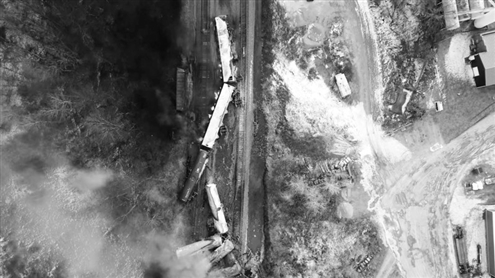 这是2月6日在美国俄亥俄州东巴勒斯坦镇拍摄的有毒化学品运载列车脱轨事故现场 新华社发