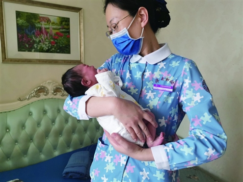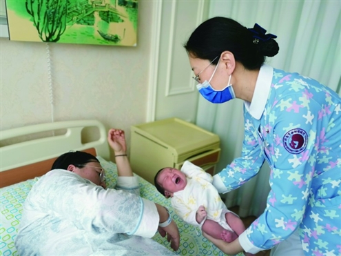 王丽双手托起新生儿送到妈妈身边并指导哺乳方法