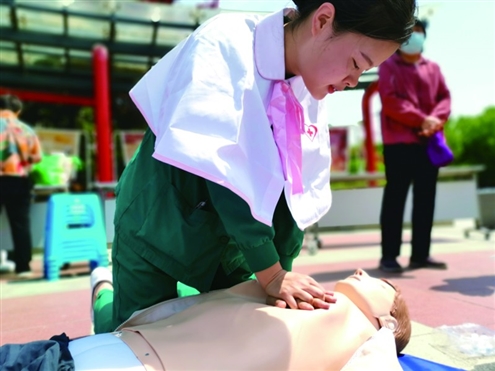 两手重合十指相扣,手指跷起来将掌根按压在病人胸口;上身略微前倾,手臂伸直,缓慢用劲按压;切合呼吸节奏地按压30-40次以上。山东省立医院年轻护士在给市民示范心肺复苏的关键步骤。她告诉记者,给病人做心肺复苏,常常按压到手又红又疼。