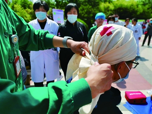 山东第一医科大学附属山东省立医院急诊科的男护士也有一双“巧手”。在日前举行的大型义诊中,这双手上下翻飞,很快演示完了头部包扎的过程,包扎得实用又美观。