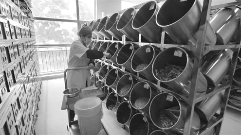 点击查看原图 过去,人们生病去看中医,望闻问切后,中医师会给患者开具中药处方,让患者或家属按方到中药房去配药,被称为“抓药”。药房往往是一面墙大的药柜上满是抽屉,抽屉里摆放着各种草药,整间屋子弥漫着中药香,司药人员手持一杆小小的秤,对照药方到身后药柜的小抽屉里抓药、称量,估摸着分摊到桌上的一排纸上后挨个打包······