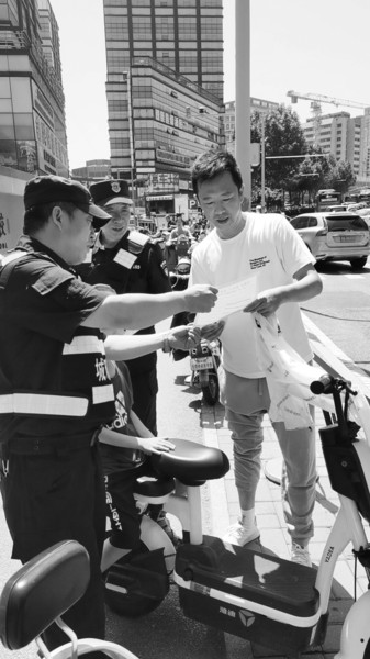 城管工作人员在宣传戴头盔的重要性