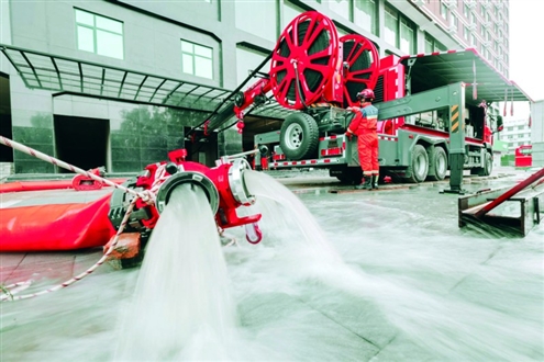 山东省消防救援总队济南支队特勤大队指挥员罗文波告诉记者,“我们是8月4日下午两点接到排涝任务的,当天下午3点20分,排涝正式开始,这次我们一共启用了三台排涝设备,其中有一台是排水机器人,另外两台是手抬机动泵。”他告诉记者,“范阳文化园A栋大楼地下车库内积水面积约为1800平方米,水深4米左右。现实际排水速度约为每小时500立方米。”