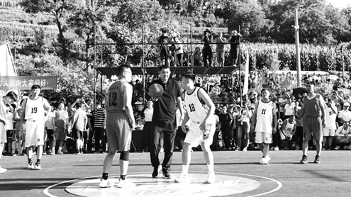 章丘区首届“村BA”上,来自官庄街道的两支篮球队展开激烈角逐(鹿洪东摄)