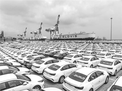 9月12日,在山东港口烟台港汽车码头,大批出口商品车等待装船发运(无人机照片)。中国汽车工业协会发布汽车产销数据:8月,我国汽车出口40.8万辆,环比增长3.9%,同比增长32.1%;1至8月,汽车出口294.1万辆,同比增长61.9%。◎新华社发