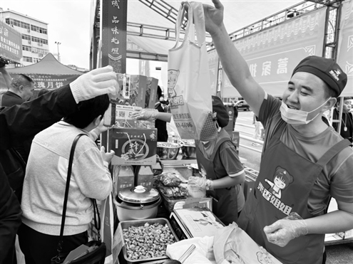 佳肴美味吸引着“吃货”慕名而来,图为商户正在叫卖糖炒栗子
