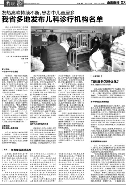 12月22日,在济南市卫生健康委网站上,全市能够提供儿科诊疗服务的医疗机构名单再次更新,数量更新到了98家。此前,山东省卫生健康委汇总公布了各市可提供儿科诊疗服务的医疗机构名单。名单中共有1886家各级医疗机构,均可提供门诊服务。根据医疗机构的具体情况,可相应提供急诊、住院和输液等服务。此外,医疗机构的服务能力,包括门诊日最大接诊量、急诊日最大接诊量、儿科住院床位数等数据和联系方式也有明确公布,给公众就诊提供详尽参考。为更好地保障儿童就诊需求,近期,我省多地卫健部门发布了可提供儿科诊疗服务的医疗机构名单,以方便患儿及时就近就医。