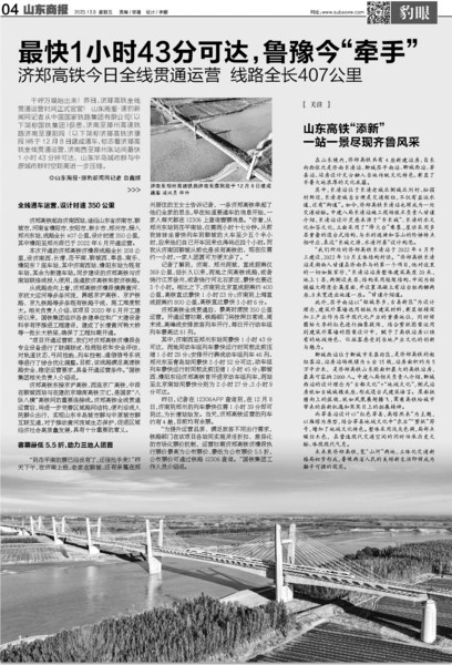 2023年,山东“八纵六横”高铁网日益完善,“市市通高铁”梦想再次拉近。12月8日,全长407公里、设计时速350公里的济郑高铁全线开通运营,从济南到郑州最快只需要1小时43分,两座万亿元级省会城市实现铁路直通。