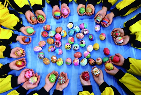 今天是春分节气,各地通过立蛋、做风筝等民俗活动,迎接春分到来。据了解,春分立蛋蕴含着人们欢庆春天的喜悦,同时也寓意希望生活蒸蒸日上,子孙鼎立。图为3月19日,在枣庄市文化路小学,学生们展示绘制的彩蛋。◎新华社发