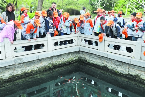 从历下亭走到二郎庙,研学导师向孩子们讲述大明湖的“三大怪”,在一声声“原来如此”中,孩子们明白了大明湖“谜团”背后的科学原理。“原来大明湖里听不见蛙鸣也看不到蛇是因为水温的关系,湖里的水久旱不干是因为连着南部山区水源的缘故。”四年级五班的赵宣懿说。