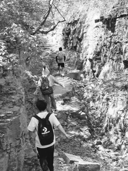 在山间行走,不是一味地向上攀登,行走在规则整齐的石梯路,而是需要上上下下,有时攀登形状各异的岩石,有时则需要侧身通过宽度不到半个脚的小路,有时需要跳跃才能通过几个并不相连的大石头。