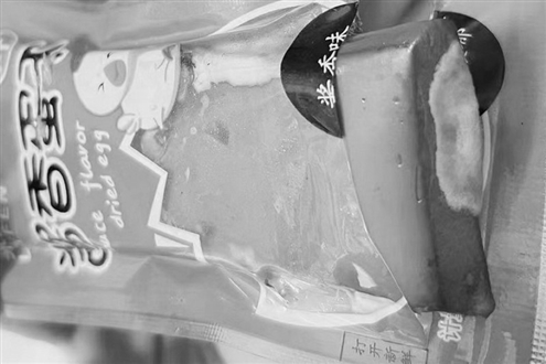 来自江苏苏州的陈女士向记者表示,此前,她在苏州的一家来伊份线下门店购买的零食遭遇了“发霉、胀袋”的食品质量问题。“在门店消费后的第二天,我就发现‘酱香蛋干’发霉长毛了,小蛋糕也胀袋了,‘酱香蛋干’ 发霉的部分是在产品包装的背面,所以从外包装看不出来有问题。”