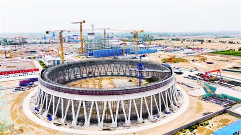 位于郓城县的大唐郓城630℃国家电力示范项目是“十三五”期间的国家重点项目,该项目将安装2台100万千瓦超超临界二次再热燃煤发电机组,使机组再热气温提高至630℃,能够提升发电效率,降低燃煤消耗。该工程于2023年8月开工,目前施工建设有序推进。图为6月5日拍摄的该项目建设现场。◎新华社发