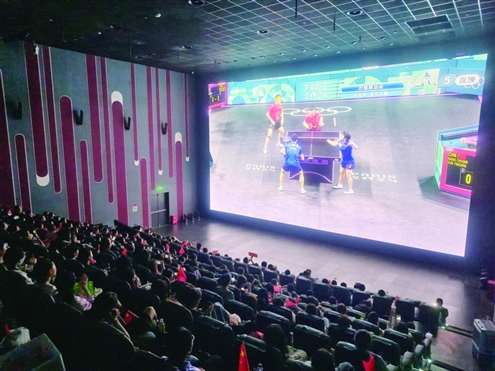 7月30日晚举行的乒乓球混双决赛,是网络上的热门事件,也是一场线下“狂欢”。据参与放映的济南某影城工作人员徐女士回忆,当天院线观看直播的人数达到了最高峰,253个座位的影厅里,有220位观众前来为中国队加油,“比赛打得十分焦灼,当中国队得分被反超时,厅内气氛也随之紧张起来,观众纷纷为我们的队员加油助威。而随着‘莎头’组合一分一分接近胜利,观众们也激动地振臂高呼。最终夺冠的瞬间,现场氛围达到了顶点,很是震撼。颁奖仪式上,随着国歌旋律响起,观众们纷纷自发起立,齐唱国歌。”