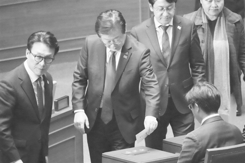 同日,韩国最大在野党共同民主党党首李在明(左二)在首都首尔的国会参加对法务部长官朴性载和警察厅厅长赵志浩的弹劾动议案投票