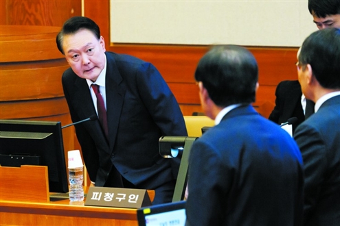 1月23日,尹锡悦(左)在韩国首尔宪法法院出席总统弹劾案庭审 新华社发