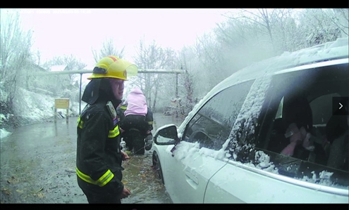 由于突降暴雪,气温也越来越低,为了防止被困人员受到低温伤害,消防救援人员决定涉水,将被困人员从车内转移到安全地带。由于积水较深,消防救援人员将被困人员背过涵洞送至安全地带。经过10分钟左右紧张救援,成功将两名被困人员救出,并通知保险公司及拖车公司将被困车辆拖出积水涵洞。
