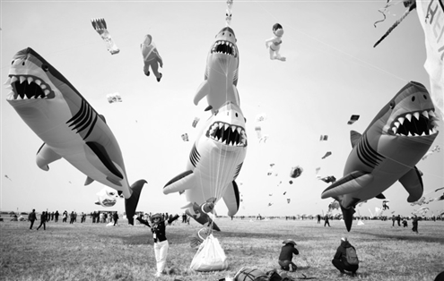 4月18日,作为第42届潍坊国际风筝会的系列活动之一,第21届世界风筝锦标赛在潍坊市滨海云门国际放飞场开赛,来自51个国家和地区的257支队伍、1971只参赛风筝参加角逐。形态各异的风筝漫天飞舞,带来一场精妙绝伦的视觉盛宴。图为当日观众在大型软体风筝前拍照留念。