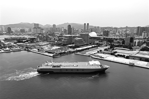 5月31日,新能源汽车运输船“绿安通”轮正式投入烟台—大连航线运营,标志着渤海海峡新能源汽车海上运输专线开通。图为当日,“绿安通”轮从锚地驶入山东港口烟台港,为正式首航大连做准备(无人机照片)。