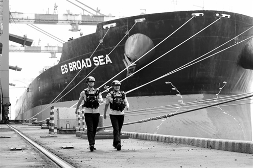8月8日,在山东港口日照港,日照出入境边防检查站民警穿戴智能头盔、云甲等警务装备开展巡查工作。近年来,日照出入境边防检查站通过人工巡逻、船艇巡航、无人机巡查等多维手段,配备现代化警用装备,构建海陆空联动的立体化口岸管控体系,实现对口岸及周边海域的安全高效监管。