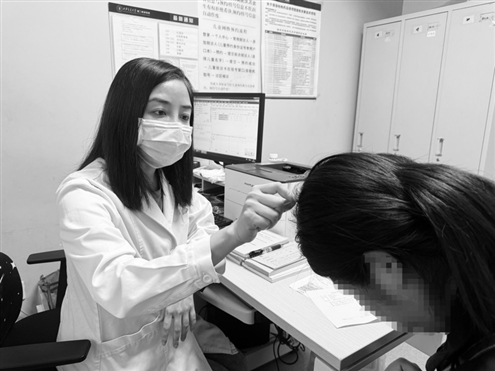 西安交通大学第二附属医院皮肤病院副主任医师王琼为患者查看斑秃情况 新华社发