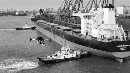 8月7日,在山东港口日照港,日照出入境边防检查站的警用无人机对抵港的巴拿马货轮进行巡查(无人机照片)新华社发