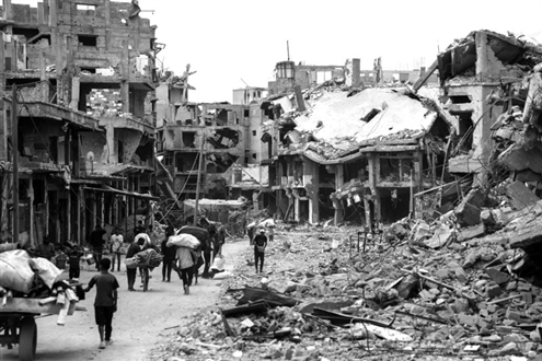 10月12日,在加沙地带南部汗尤尼斯,重返家园的巴勒斯坦人走过严重受损的建筑 新华社发