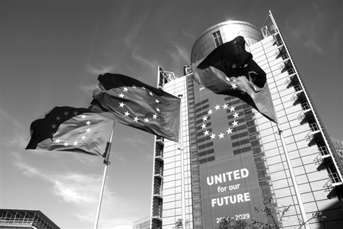 2025年4月2日在比利时布鲁塞尔欧盟总部外拍摄的欧盟旗帜 新华社发