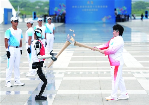 ▲第十五届全国运动会火炬传递2日在香港、澳门、广州、深圳四个城市同步举行,这是全运会历史上首次跨境火炬传递,也是全运会火炬首次在香港和澳门传递。此次火炬传递,应用了智能机器人等进行火炬传递或串联路段,凸显粤港澳大湾区作为国际科技创新中心的产业优势。图为当日于洋(右)与火炬手人形机器人“夸父”在火炬传递中。◎新华社发