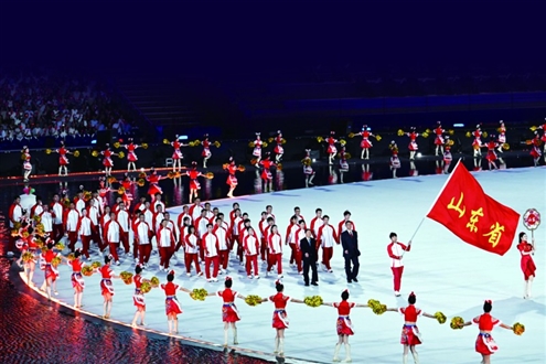 中华人民共和国第十五届运动会9日晚在广东省广州市隆重开幕。中共中央总书记、国家主席、中央军委主席习近平出席开幕式并宣布运动会开幕。这是首次由粤港澳三地联合举办的全国运动会。图为11月9日,山东省体育代表团在入场仪式上。◎新华社发