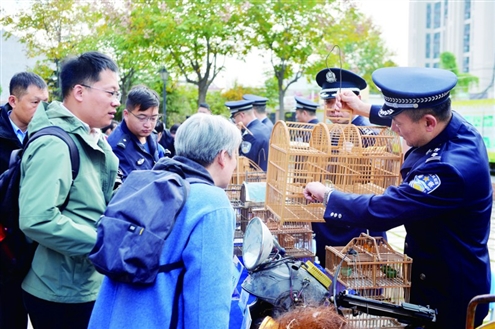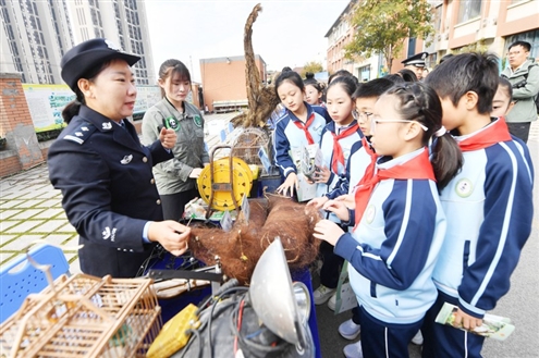 11月11日,2025年山东省野生动物保护宣传月主场活动暨全省公安机关“平安原野”专项行动集中宣传活动在青岛市城阳区棘洪滩街道春阳路小学拉开帷幕。本次活动通过“实践体验+现场宣传+互动科普”等形式,将野生动物保护理念从课堂延伸到社会,提升人们对野生动物保护的认知度、责任感与参与度。左图为民警在活动上为市民讲解爱鸟护鸟知识,右图为民警为学生讲解捕鸟网的危害。
