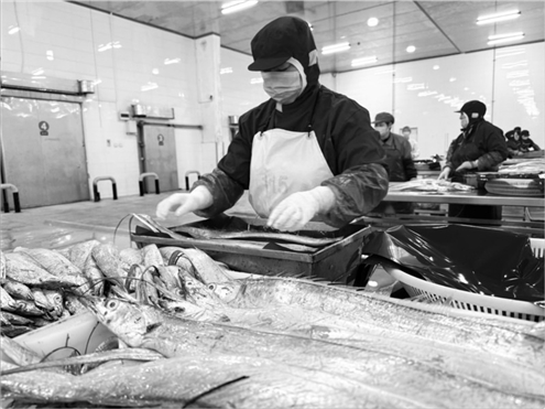 渔船靠港,夏彬皓第一时间登上渔船,查验新一批的到港带鱼。经过质检员和他的“初筛验货”后,一箱箱覆冰的海捕带鱼被迅速转运至码头附近的工厂进行冷冻和加工。以畅销的舟山带鱼段为例,精选的中段带鱼好肉,经过“去头、去尾、去内脏”的三去处理后,再采用双螺旋单冻锁鲜技术快速冷冻,最快三十分钟,加工好的带鱼就可以装箱走货,发往全国各地。