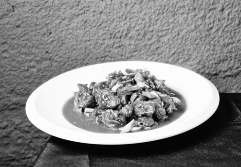 制作红烧肉的灵感则源自临沂本地经典的炒鸡火爆技法。他精选现宰鲜肉,经过一整夜的清水浸泡以充分去除血水与腥气。初熟处理后,以猛火快炒,锁住肉汁与鲜味,临出锅前,投入皱皮辣椒、小米辣与新鲜葱段,瞬间激发出层次丰富的复合椒香。成菜色泽红亮诱人,香气热烈奔放,既保留了北方菜系的豪迈气韵,又融入了亚洲料理中对于香辛料运用的精致理解。