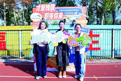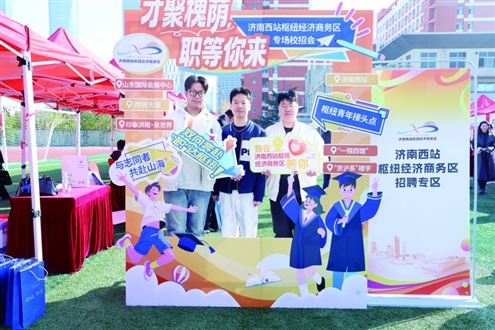 13日下午,济南西站枢纽经济商务区“才聚槐荫·职等你来”系列校园招聘会走进济南大学。