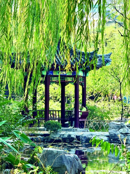 沿潭边漫步,朱红的亭廊与金黄的银杏、碧绿的泉水构成鲜明的色彩对比。老人们坐在亭下晒太阳、拉家常,孩子们追着落叶奔跑,偶尔停下脚步观察水中的鸭子,欢声笑语为静谧的公园添了几分生机。暖阳斜照时,光影在墙面、地面流转,将古树的枝丫、亭台的飞檐勾勒成灵动的剪影,随手一拍便是定格时光的美景。