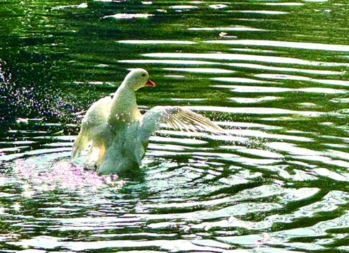 园内的银杏树是初冬的主角,金黄的叶片在阳光下熠熠生辉。微风拂过,扇形的落叶簌簌飘落,铺满青石小径,踩上去沙沙作响。部分叶片落在水面,如一叶叶小金舟,随泉水缓缓漂流,与水中嬉戏的鸭子相映成趣。几只白鸭、灰鸭自在游弋,时而扎入水中觅食,时而拍打翅膀梳理羽毛,激起的涟漪扩散开来,晕开了岸边的树影与亭台倒影。