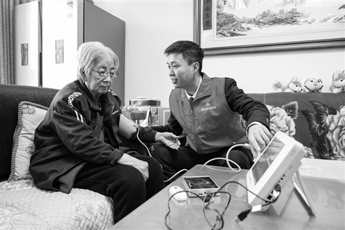 养老服务员在淄博市张店区马尚街道金石社区上门开展每日健康监护服务,相关数据可同步到老人亲属手机上。新华社发