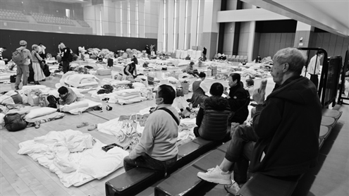 民安队和关爱队的工作人员穿梭其间,轻声询问市民需求,不时为老人递上热水,或分发食物。入口处设置了简易医疗中心等,为受灾市民提供援助。
