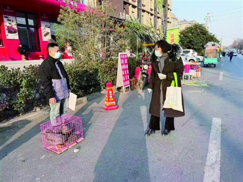 第一次见到封亚军时,他正站在山东省肿瘤医院正北门的街头,手里拿着一块《感恩济南爱心鸡》的红色牌子,红色牌子下面的粉色笼子中有四只公鸡时不时发出叫声,一对母女跟他面对面站着。此时的封亚军目不转睛地看着路上来来往往的人群,脸上略显疲惫。