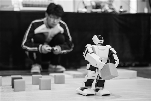 日照市近年来不断推进技能人才队伍建设,把职业技能竞赛作为培养高素质高技能人才的重要途径,坚持以赛促学、促教、促训,将技能培训、岗位练兵和技能竞赛相结合,促进就业、创业。图为12月19日,参加日照市技师学院第14届技能文化节的选手在进行服务机器人项目比赛。