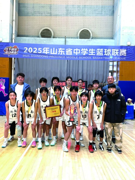 尤其是2021年重组的女篮队伍,队员起初多为零基础,起步艰难,但教练与队员们从未气馁。2021年济南市中小学生篮球比赛第九名的成绩,成为她们反思精进的起点;2022年斩获槐荫区冠军、济南市联赛第六名,实现稳步提升;2023年依托槐荫区“一纵一横”全域培养机制,在区教体局与学校领导的大力支持下,生源质量持续优化,比赛机会不断增多,一举拿下槐荫区冠军、济南市锦标赛亚军等多项荣誉;2024年再攀高峰,将槐荫区冠军、KFC城市冠军赛三对三济南站亚军等荣誉收入囊中;2025年更是闪耀省市级赛场,荣获山东省中学生篮球联赛季军、省级一等奖,以及济南市三人制篮球冠军、校园篮球超级联赛冠军等多项殊荣,时隔十四载重夺济南市初中女子篮球冠军,用实力书写了体教融合的精彩答卷。