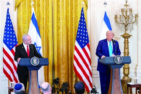 今年2月4日,在美国华盛顿白宫,美国总统特朗普(右)与到访的以色列总理内塔尼亚胡会晤后举行联合记者会。新华社发
