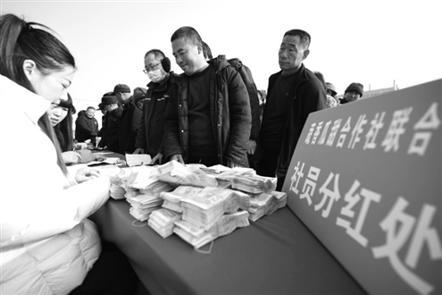自2018年以来,沂南县苏村镇积极探索乡镇党委领办联合社发展模式,按照“支部引领、集体持股、群众参股”的方式,整合村级经济股份合作社和农民加入联合社,依托当地资源优势,大力发展蔬菜种植、批发销售等产业,农民既当股东又当工人,在壮大村级集体经济的同时,带动农民在家门口增收致富。图为30日,村民在分红大会上领取分红。