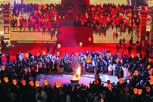 1月1日,在临沂市郯城县郯国古城景区,游客参加篝火晚会