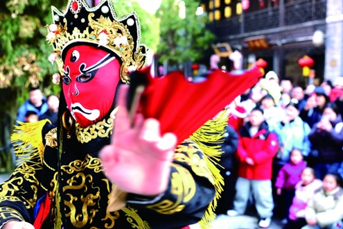 在台儿庄古城,民间艺人进行“变脸”表演
