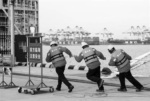 新年伊始,各行各业的劳动者们坚守岗位、接续奋斗,在忙碌的工作中度过元旦佳节。图为1月1日,在青岛前湾港区,随着货轮缓缓靠岸,码头工人在固定缆绳。