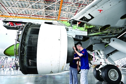 我省将打造集群式航空维修产业基地。图为日照市一航空产业公司员工正维护飞机。新华社发