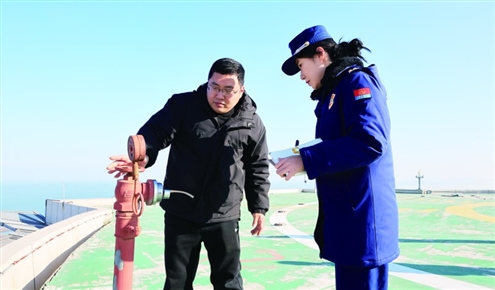 烟台市超高层建筑火灾隐患整治检查组正在检查楼顶停机坪室外消火栓 消防供图