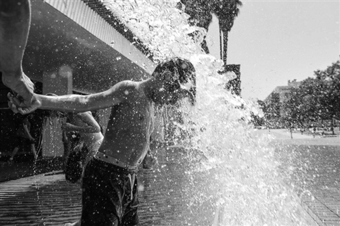 2025年8月3日,一名男孩在葡萄牙里斯本的一处喷泉玩耍消暑。