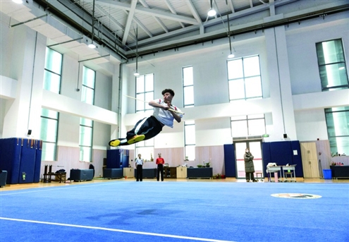 日照市体育运动学校成立于1988年,是日照市唯一一所市级竞技体育和体育职业学校。学校坚持“为特长发展拓展空间·为学生成才搭建平台”的办学理念,培养了大量体育人才,在省级以上比赛中屡获佳绩,毕业生考入北京体育大学等多所高校,被国家体育总局评为“国家重点高水平体育后备人才基地”。图为武术队的学生进行棍术训练。